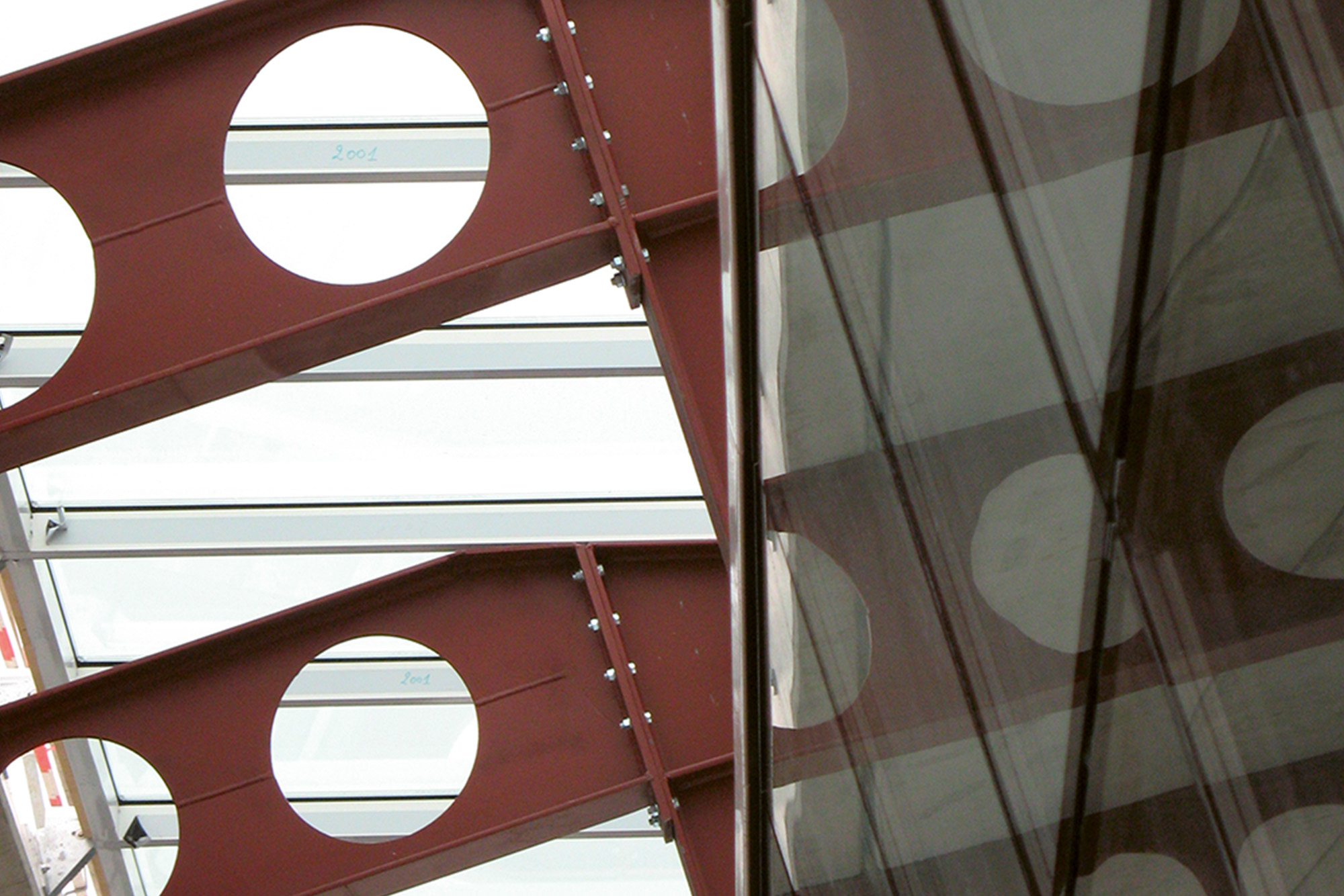 Zeven stalen luifels overdekt met gelijmd glas
