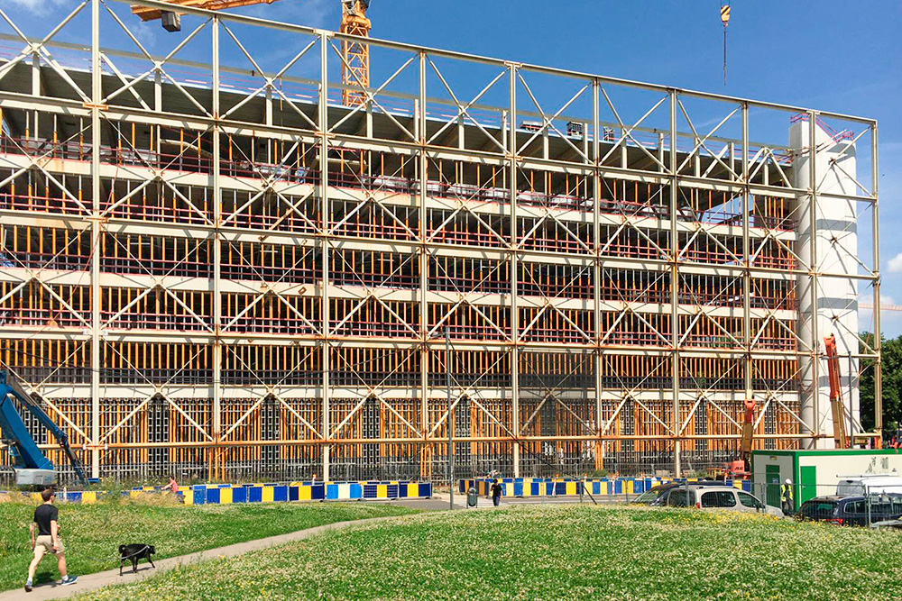 De multifunctionele infrastructuur biedt ongeveer 8.000 m² ruimte verdeeld over 7 verdiepingen, met verdiepingen die worden ondersteund door cellenliggers met een overspanning van 15 meter die aan beide kanten worden ondersteund door een stalen exoskelet en externe betonnen kolommen.