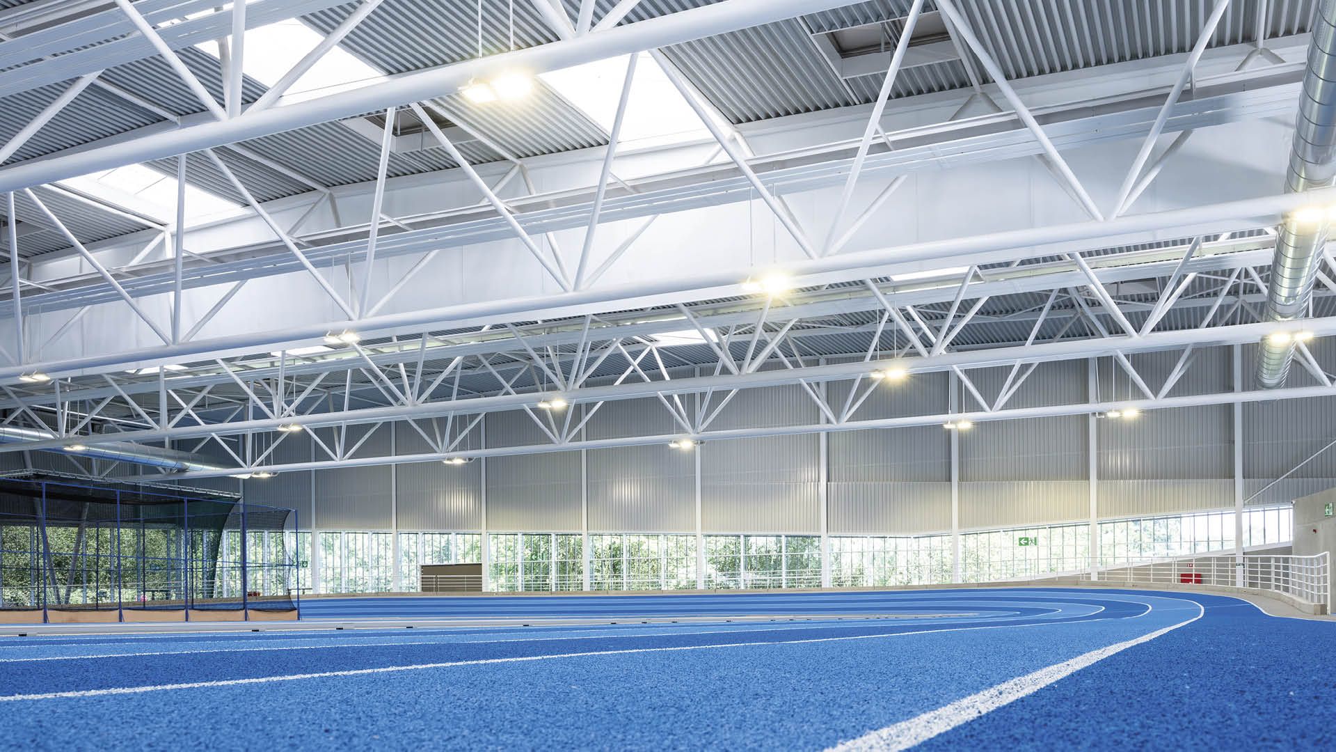 Implanté à Louvain-la-Neuve, ce centre d’entraînement, de formation et de compétition indoor mesure 80 m de large pour 130 m de long, soit environ 10.000 m2 au sol sans colonne intérieure. La structure de 540 t en acier S355 est constituée de portiques transversaux de 80 m de long et de 14,60 m de haut. Les colonnes d’extrémité ont une forme de V, limitant ainsi les points d’appui et donnant à la structure une silhouette plus architecturale. La toiture est constituée de 8 poutres treillis tridimensionnelles d’une portée de 80 m.