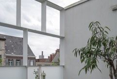 La façade avant rythmée en acier abrite un magasin de fleurs et une habitation au centre de Zottegem. L’encadrement d’ailettes en acier blanc de 20 cm de profondeur (partiellement transparent, partiellement avec vitrage opale) assure la continuité formelle de la rangée de façades. C’est également un filtre pour le respect de la vie privée pour les zones de vie. Grâce à la grande hauteur derrière l’écran, un rayonnement est créé qui est analogue aux espaces commerciaux antérieurs de la ville.