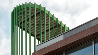<p>Les passerelles en porte-à-faux en acier ont été boulonnées aux colonnes en béton, créant ainsi un lien entre les différentes parties de l'école et offrant une conception ouverte et accessible. Les cages d'escalier autoportantes des deux côtés du bâtiment, faites de tubes d'acier vert, intègrent visiblement les techniques dans la conception, permettant au bâtiment de servir de matériel pédagogique. Ces structures en acier favorisent l'efficacité énergétique, la flexibilité et l'intégration esthétique dans l'environnement. </p>