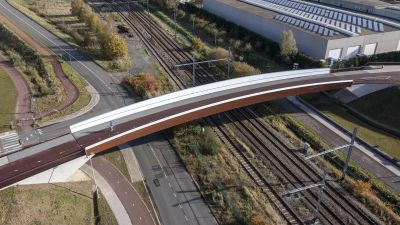 Kronkelende fietsersbrug over Genkse Ring