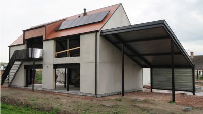 Tekst: <p>De opdrachtgevers, ware autofanaten, wilden een industriële woning bouwen waar ze voldoende plaats hadden om minstens 4 auto’s te stallen. Bijna de volledige gelijkvloerse verdieping is gewijd aan hun auto’s. Naast een grote garage, goed voor twee wagens, werden twee overdekte staanplaatsen voorzien ter hoogte van de inkom. <br>Om deze grote open ruimtes te kunnen realiseren en ook om economische en ecologische redenen, werd er geopteerd voor een staalstructuur. De staalstructuur werd bekleed met sandwichpanelen met 150 mm PIR-isolatie en het dak is voorzien van geprofileerde stalen dakplaten (steeldeck) en 160 mm PIR-isolatie. <br>Naast de geplaatste isolatie werden ook milieuvriendelijke technieken toegepast zoals zonnepanelen, warmtepomp, ventilatiesysteem D. Binnen in de woning werd het industriële karakter verder doorgezet in het gebruik van kabelgoten, zichtbare ventilatiekanalen, enzovoort. Het resultaat is een betaalbare, moderne, industriële BEN-woning (Bijna energieneutraal)!</p>