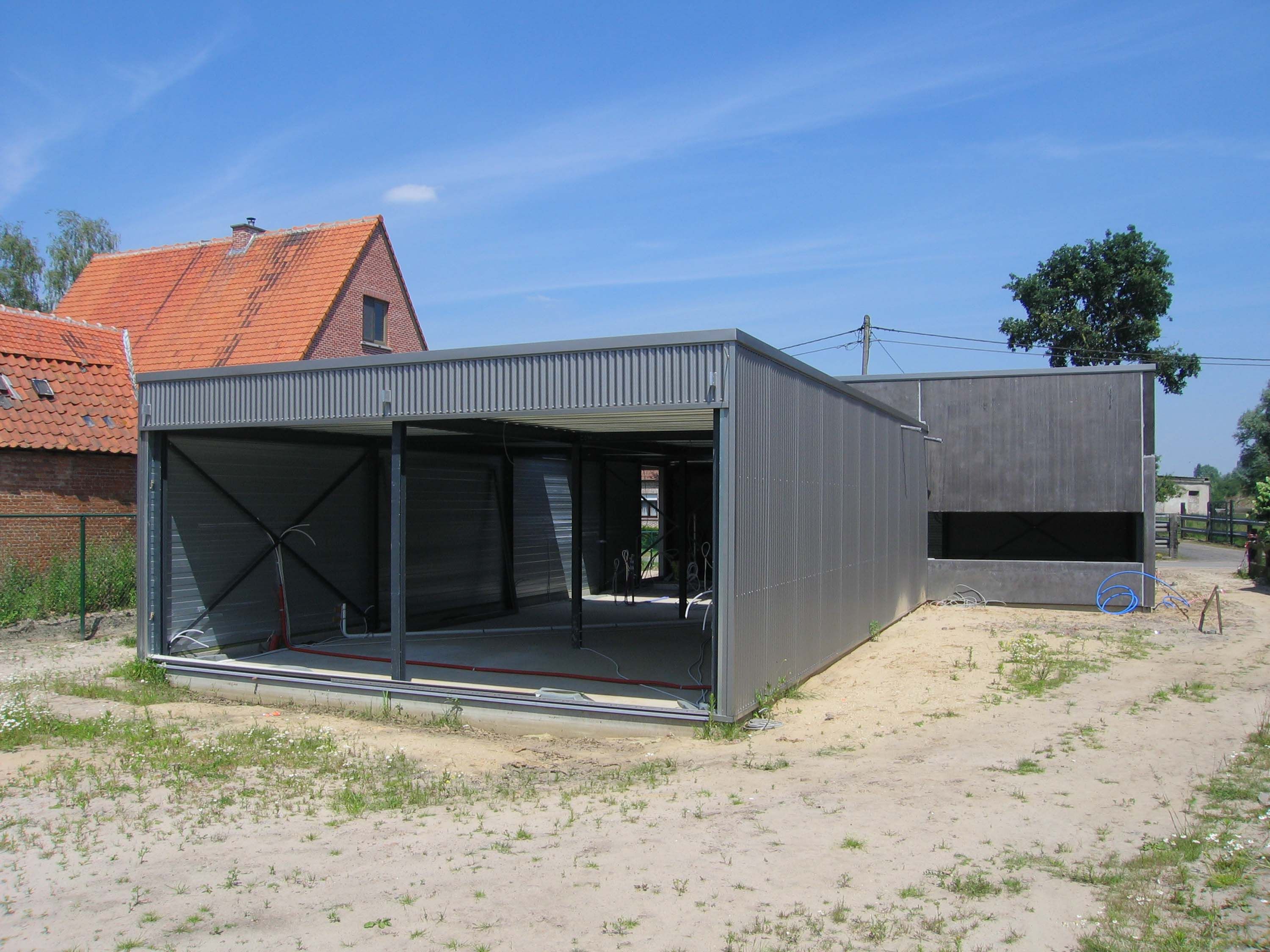 Een kruisvormig staalskelet met HEB100-kolommen en IPE200-liggers moduleert de ruimte onder een plat dak van galva-steeldeckplaten. De gangbare dakwindverbanden worden vervangen door galva-bandstaal, verwerkt in de dakopbouw. Een langwerpig bouwvolume met galva-binnendozen en gegolfde profielplaten focust op de tuin. Een dwars geplaatst betonnen volume met doorlopend geïsoleerde, gladde sandwichpanelen plaatst de hogere werkruimte tussen de dag‐ en nachtvertrekken.
