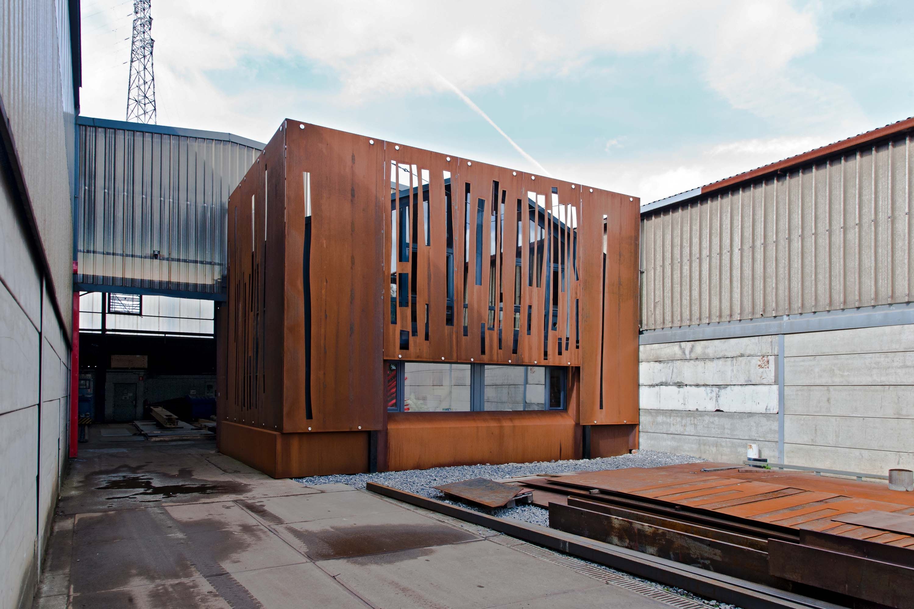 Pour le projet présenté ici, les ateliers Melens et Dejardin ont commandé à l'architecte la conception d’une transformation et la requalification d’un espace de bureau, à mettre en œuvre (conception et exécution) en moins de deux mois. La conception s’inspire de ce que la tôlerie peut apporter comme solutions techniques en matière de construction. La feuille d’acier est utilisée à la manière d’un drap tendu sur un fil à linge et suspendu à des "pinces". La tension est bloquée au niveau inférieur. Les «pinces à linge» sont réalisées spécifiquement pour le projet sous la forme de boulons alésés de grand gabarit. La tôlerie est en acier Corten pour ne pas nécessiter de traitement ultérieur. Les feuilles de façade sont découpées selon les contingences intérieures des bureaux : vues, lumière et aération. Après numérisation, la découpe finale a été testée sur tôle mince à l’oxydodécoupeuse. Le résultat final devait exprimer les compétences nouvelles de l’entreprise.