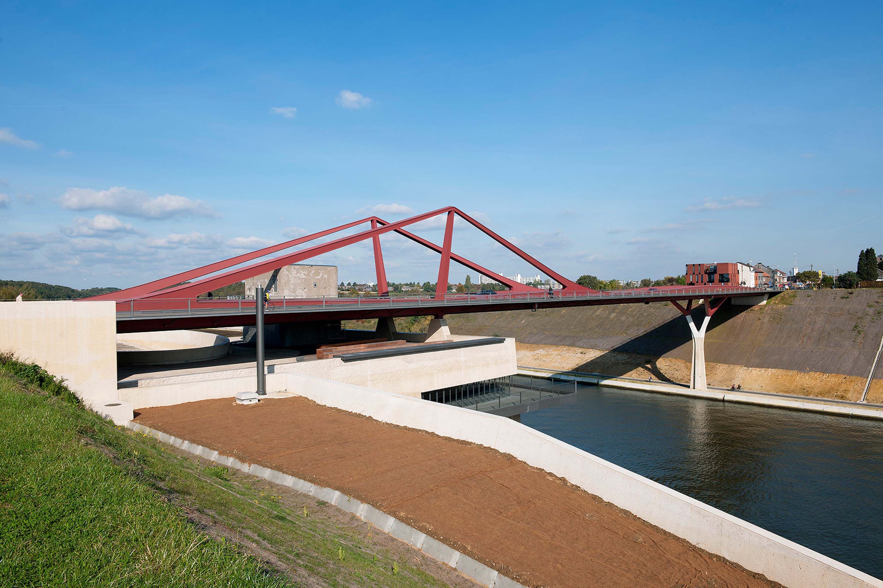 Le pont en béton existant avait été construit juste après la Deuxième Guerre mondiale et devait être remplacé en raison de l’élargissement du canal Al-bert ayant pour but de permettre la navigation in-térieure jusqu’à 9000 tonnes. Le nouveau pont en acier (1040 tonnes) a une portée centrale de 100 m et ouvre de cette manière un passage libre de 86 m sur l’eau. Le site étant classé, les conditions d’intervention étaient complexes. C’est précisé-ment à cet endroit que la Belgique est entrée dans la Seconde Guerre mondiale ; le bunker côtoyant le pont en étant le témoin silencieux. Toute la mission de conception (stabilité, architecture et paysage) a été réalisée par le bureau Ney & Partners, en colla-boration avec l’artiste Jozef Legrand.