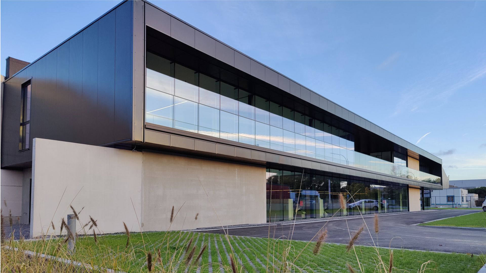 L'ensemble de la structure porteuse a été réalisée en profilés d'acier. En raison de la conception élancée, de l'espace ouvert que l'on souhaitait créer et de la terrasse en porte-à-faux à l'avant, une solution avec une structure en acier offrait les meilleures possibilités. La structure de toit traditionnelle des hangars industriels ne pouvait pas offrir une solution dans la structure enveloppante pour répondre aux exigences visuelles de l'architecte. Les plaques de toit et de plancher devaient être incorporées autant que possible dans les profilés. Pour ce faire, des plaques ont été soudées dans ou sous les profilés afin de maintenir la couverture (steeldeck) ou les voûtes de plancher. En outre, les colonnes visibles ont été construites dans des éléments en caisson pour se conformer à cette règle. Cela a donné lieu à des nœuds difficiles, car 3-4 poutres sont arrivées au même endroit.