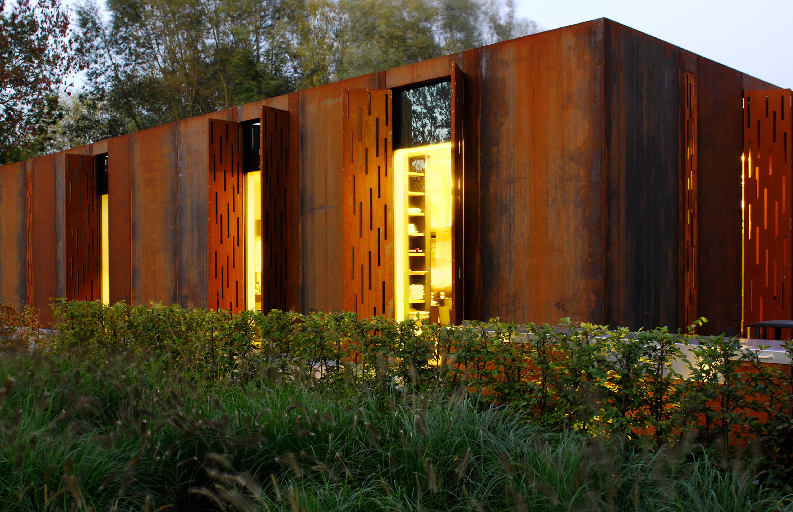 Door de verticale opbouw van de gevel in weervast staal van 4 mm ontstaat er een interessant spel tussen de gesloten delen en de hoge raamoppervlakken. Deze laatste worden beschermd door ingekeepte vouwelementen, eveneens in weervast staal, die een prachtige lichtinval mogelijk maken. Er werd dus bijzondere aandacht aan de buitenbekleding besteed, zowel wat de gebruikte materialen als de functie van de gevel betreft.