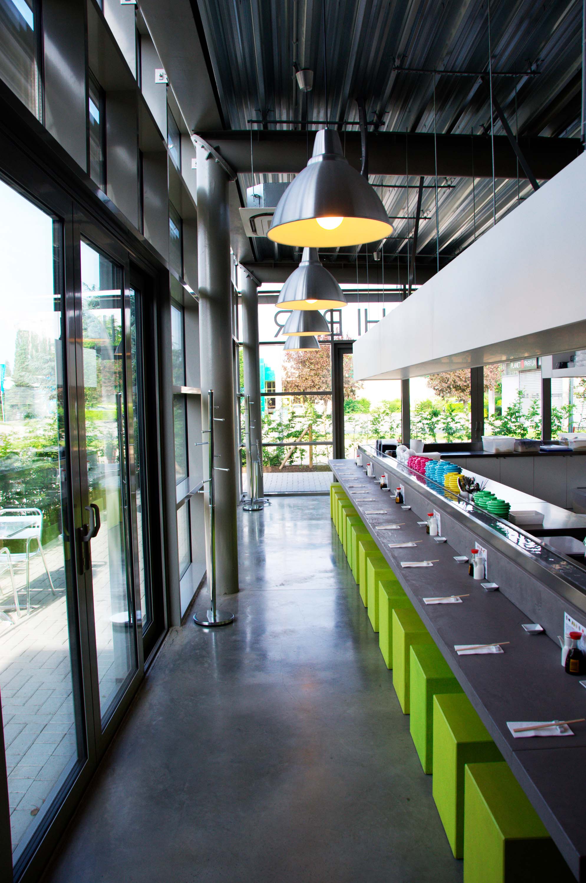 Le projet consiste en la construction d’un restaurant « Sushi » de 150 m2 à Gosselies. La volonté d’obtenir un aspect intérieur « brut » de type industriel été rencontrée par le choix de panneaux de béton en façade avec fond de coffrage en bois extérieur et lisse de béton à l'intérieur, une dalle de solen béton lissé, l'absence de faux-plafond et le choix d'une structure et de techniques apparentes. La structure étant visible dans le restaurant, l’acier répond à la volonté de matériaux bruts et de dégagement de l'espace. L’emploi de portiques tubulaires circulaires permet d’éviter des d’angles, comparativement aux profils « H » ou « I », donc d'éviter les nids de poussières, et rencontre les impératifs des normes sanitaires en vigueur. Un « T » renversé a été placé sur le tube afin de permettre la fixation des tôles de type Steeldeck 106. Les contreventements sont réalisés en câbles