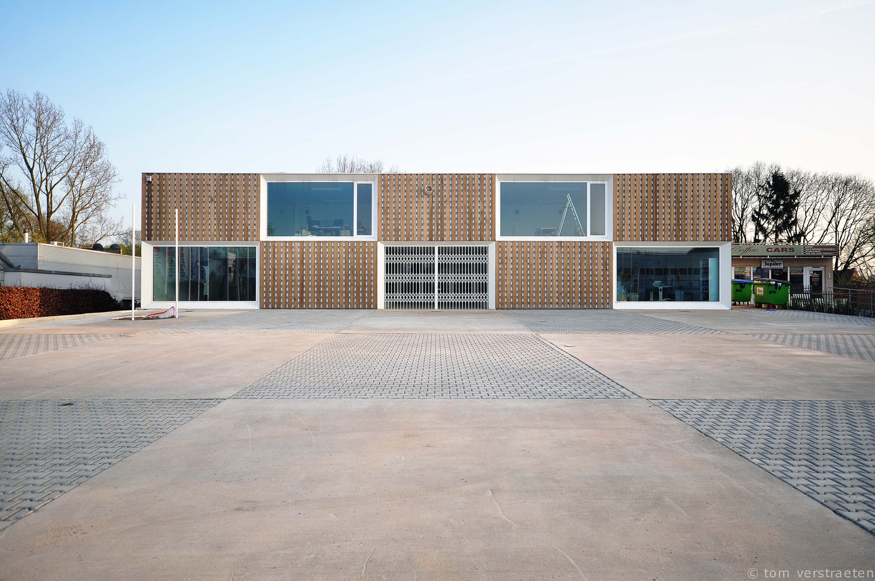 Een voormalige disco langs de Molsesteenweg in Geel, heringericht als commercieel pand, werd volledig gestript en uitgebreid met kantoren, inkom en magazijn. Dit nieuwe programma moest volledig in een extra strook passen, in een balkvormig volume dat voor de voorgevel geplaatst werd. De nieuwe voorgevel wordt opgevat als reclame, als blikvanger. Verticale houten planken op een horizontale bardage leveren een Moiré-effect op, dat de aandacht van de passant moet trekken. De raamomlijstingen bestaan uit witgelakt staal.