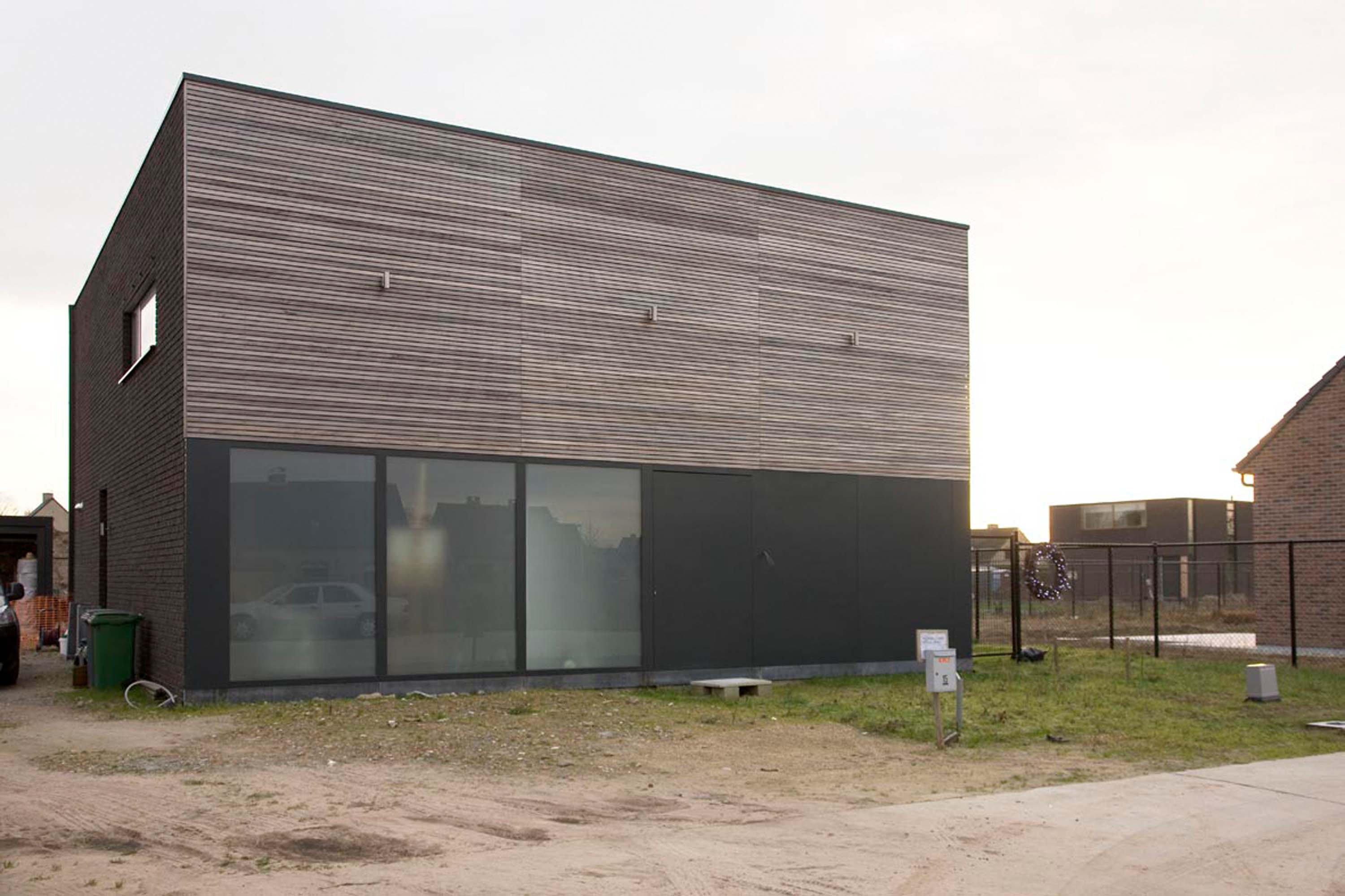De traditionele gevelmaterialen van deze woning, geplaatst omwille van de verkavelingsvoorschriften, contrasteren met de staalconstructie. Binnen blijven alle industriële materialen zichtbaar en worden ze aangevuld met een warme materiaalkeuze en sfeervolle verlichting.