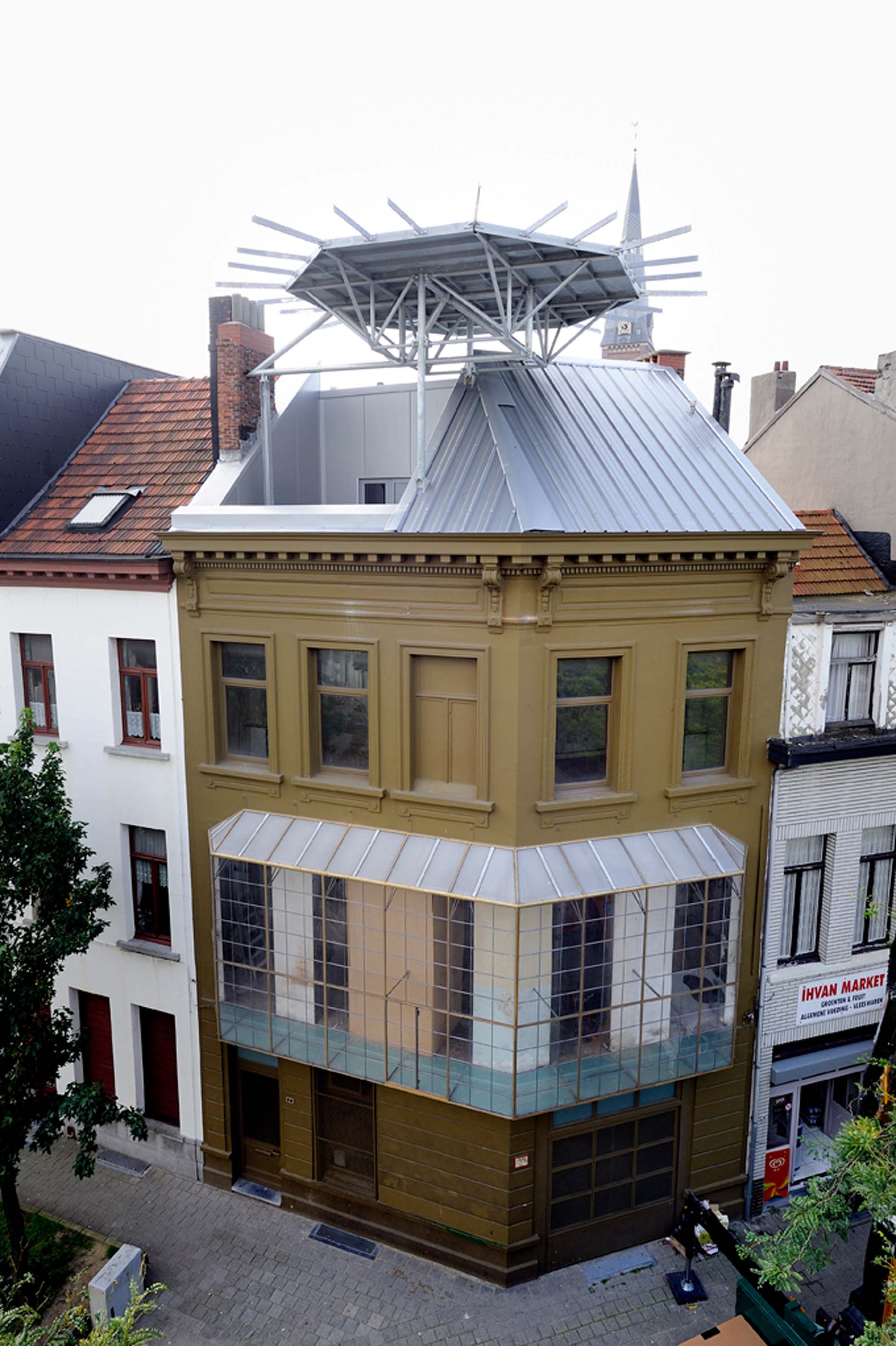 Kunstenaar-wetenschapper Panamarenko schonk zijn eigen woning annex atelier, gelegen in de Biekorfstraat 2 te Antwerpen, een aantal jaren geleden aan het M HKA. Het pand werd vorig jaar gerenoveerd. Als kers op de taart van de renovatiewerken, plaatste architect Luc Deleu een helikopterplatform uit verduurzaamd staal op het dak. Het bestaat uit een T-vormig portiek van buisprofielen (diameter 114,3/5 en staalklasse S355) en een secundaire structuur van buisprofielen (diameter 60,3/5, staalklasse S355) die erop geënt is. Een 8 millimeter dikke staalplaat met opgelaste vinnen maakt de overspanning en doet dienst als landingsplatform. Rondom de landingsplaat is een vangnet aangebracht, bestaande uit geprefabriceerde trapeziumvormige wapeningsnetten (diameter 6/100) met vinnen van massief staal.