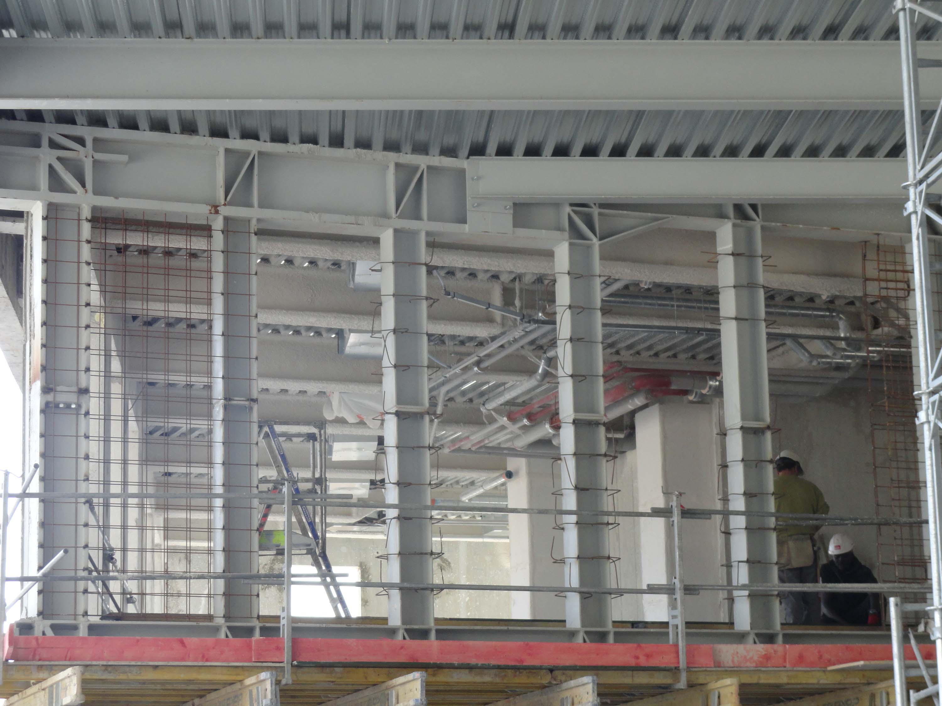 De stalen liggers werden met RF behandeld door middel van een flocage. De staalplaatbetonvloer werd zo berekend dat hij met een extra-bijlegwapening ook een brandweerstand verkrijgt.