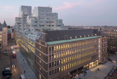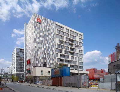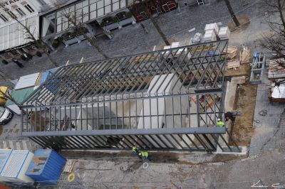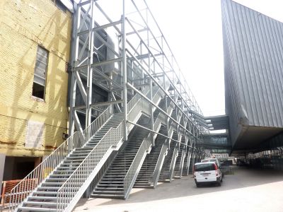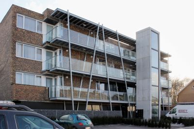 Tekst: De toepassing van de stalen structuur in dit project is tweeledig: enerzijds zorgt ze voor de ontsluiting van de appartementen door middel van buitenpasserelles, anderzijds wordt ze gebruikt om de stalen structuur van de private terrassen van de woningen te dragen en de historische gevel te stabiliseren. Ook vloeren, borstweringen en trappen zijn in stalen looproosters uitgevoerd. Verder werd ook grotendeels een metalen geprofileerde gevelbekleding toegepast.