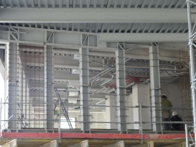 Bovenop de kolommen van dubbele verdiepingshoogte werd een volledig stalen skelet gebouwd. Door het gebruik van staal kon een verdiepingshoge vakwerkligger gebruikt worden die zowel op het niveau van de onder- als bovenregel belast wordt door een verdiepingsvloer. Met een constructiehoogte van slechts 50 cm kon een overspanning van 21 m gerealiseerd worden. De middenoverspanning van 9 m is vrij van diagonalen volgens het Vierendeel-principe; het eerste en laatste vak van 6 m is met een diagonaal verstijfd.