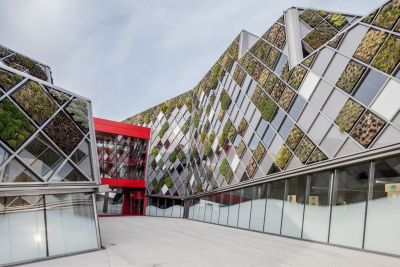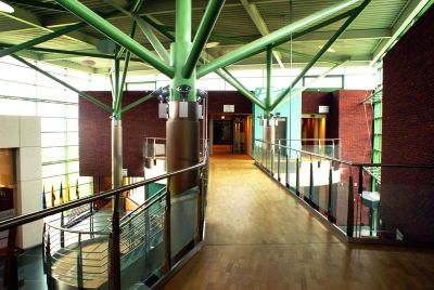 Tekst: Het nieuwe stadhuis (12.500 m²) trekt de aandacht door zijn gevels: bedekt met planten, hellend en allesbehalve rechtlijnig, met gordijngevelprofielen onder 45°, aangevuld met een loopbrug in felrood, op twee niveaus, die de twee vleugels met elkaar verbindt. Verdere kenmerken zijn het gebruik van vloeren van hout en beton, gedragen door een grotendeels zichtbaar metalen geraamte.