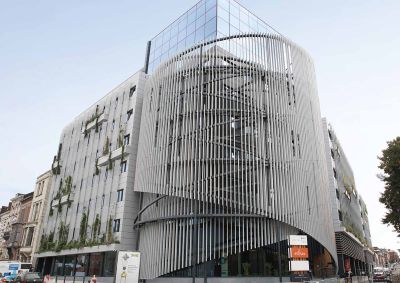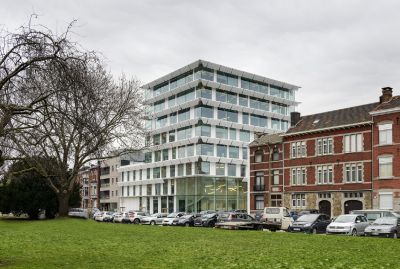 Tekst: Het gebouw omvat 3.300 m² kantoren, vergaderzalen, een restaurant en een café-restaurant en 2 ondergrondse parkeergarages met 145 plaatsen. De uitdaging was om 7 kantoorverdiepingen te bouwen op een plek waar stedenbouw er in principe slechts 6 toestaat. Dit was enkel mogelijk dankzij een stalen skelet rond de centrale betonnen kern, bestaande uit PRS-profielen (S355) waardoor de afstand tussen de verdiepingen met 30 cm verminderd kon worden.