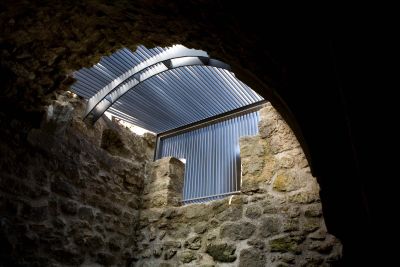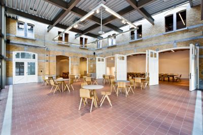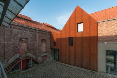 Tekst: Het behoud van het huidige karakter van de site was cruciaal bij de inplanting van het nieuwe programma in dit historische complex. Meest ingrijpend was de aanpassing van de dakvorm en de gevelbekleding van de verbinding tussen de originele voertuigenloods en de oude brouwerij. Voor de stabiliteit werden bijkomende stalen geveltrekkers en liggers in de kelders geplaatst. Houten spanten en liggers werden zo subtiel mogelijk met stalen spalken en spanners verstevigd.
