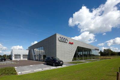 De Audi-showroom van Coox Motors werd ontworpen volgens het Terminalconcept van Audi, een visionaire architectuur met een design uit meerdere lagen. Er werd gebruik gemaakt van een stalen draagstructuur en stalen gevel (Alu-geperforeerde plaat) met honingraatstructuur. De grote glaspartij maakt de strakke look compleet. De eyecatcher in het interieur is de gebogen wand, bekleed met zwart steentapijt.<br>