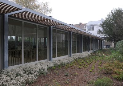<p>De nodige aandacht werd besteed aan de warmtebeheersing. Daartoe werden ruime dakoversteken en zonneweringen voorzien. Tijdens de ontwerpfase werden bezonningssimulaties gemaakt.