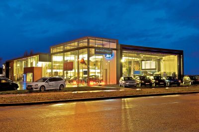 Omwille van de openheid en de lichtheid van de constructie kozen de ontwerpers bewust voor een staalconstructie. <br>Elk detail werd met aangepaste software zeer grondig bestudeerd en uitgewerkt waardoor de staalconstructie nog krachtiger overkomt. Blikvanger is het 8 m hoge hoekvolume. De gevels afgewerkt met glas en grijze sandwichpanelen, geven de toegang tot de toonzaal een uitnodigend karakter.