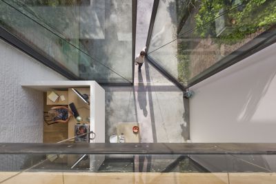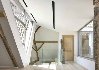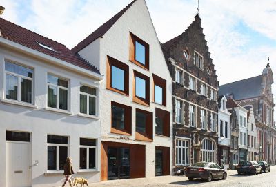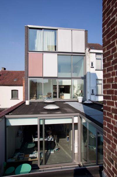 Tekst: De verbouwing van een eengezinswoning tot een appartement met drie verdiepingen en 3 gastenkamers vereiste twee belangrijke interventies: het herbouwen en uitbouwen van de achtergevel, en een gedeeltelijke verhoging van het dak. De structuur van de bijgebouwen werd verwezenlijkt via een spel van stalen balken en kolommen. De hele huid van de bijgebouwen aan de achtergevel werd uitgevoerd in witte (gegalvaniseerde en voorgelakte) golfplaat.