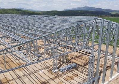 Daarom werd geopteerd voor een staalconstructie met zaagtand- of sheddak met drie schuine dakvlakken. Aan de noordzijde wordt licht betrokken via stalen raampartijen. Aan de zuidzijde zijn de dakvlakken volledig benut voor de plaatsing van zonnepanelen.<br>