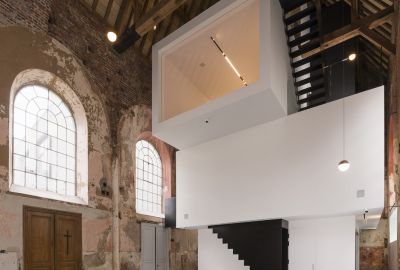 Tekst: Klaararchitectuur bouwde een 16de eeuwse kapel om tot haar nieuwe uitvalsbasis. Vier strakke, op elkaar gestapelde dozen zorgen voor een mooi contrast. De stapeling is geschrankt, waarbij de dozen overkragend staan ten opzichte van elkaar. De nieuwe staalstructuur, bestaande uit HEB-liggers, staat los van het bestaande gebouw. De vloeren zijn gemaakt uit stalen Z-profielen van 140 mm hoog ter ondersteuning van een houten vloerafwerking. De trappen uit gelaserde staalplaten. Het oude eiken dak werd verstevigd met stalen elementen.