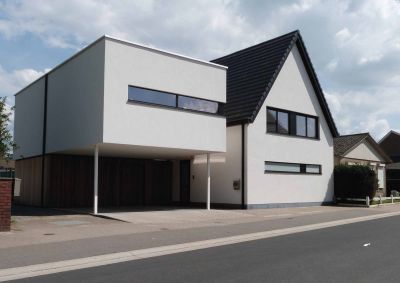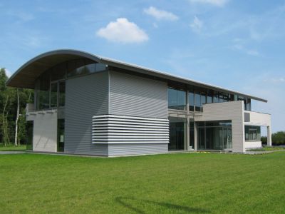 Tekst: Een bungalow uit de jaren zestig, waarvan het interieur reeds was gerenoveerd, werd omgebouwd tot een modern en open kantoor met woning. De staalconstructie van het kantoor liet toe om de verdieping te laten uitkragen en hierdoor een open carport te creëren. De gevels van zowel de uitbreiding als de bestaande woning werden afgewerkt met zelfdragende stalen voorgelakte sandwichpanelen (Kingspan Evolution) en extra minerale wol. De staalbouw leverde verleende het gebouw een eigen karakter en vormgeving.