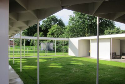 Tekst: <p>Kortrijk Xpo is een typische expo-site: een bonte verzameling van hallen, onderlinge verbindingen, opbouwplateaus en groen. Rondom dit chaotisch geheel werd een galerij geplaatst. Dit kader is opgebouwd als een modulair stalen raster.<br>