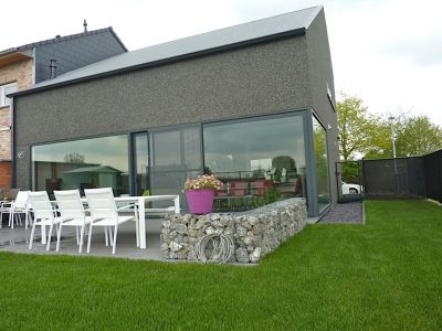 Tekst: Het was de bedoeling van de eigenaars om hun huis te moderniseren en er hun beroepsactiviteiten in onder te brengen. De leefruimte in huis werd aan de kant van de tuin vergroot. De uitbouw werd bekleed met weervast cortenstaal. Door hetzelfde materiaal toe te passen voor de muuropeningen, de ingang van het tandartskabinet en het nieuwe volume, kreeg de hele verbouwing een coherent uitzicht.