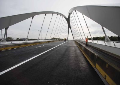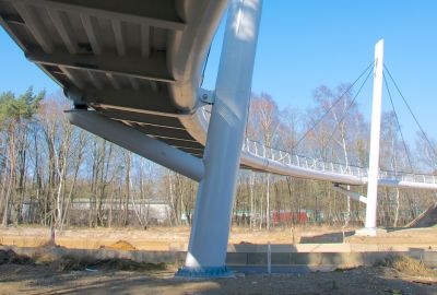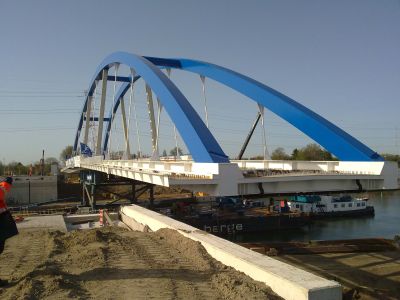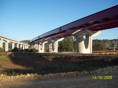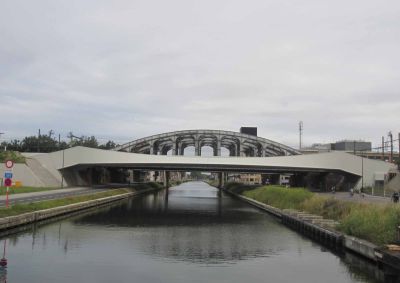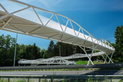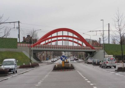 De keuze van staal liet toe deze gebogen spanten te realiseren met zo weinig mogelijk kolommen. De stalen buisprofielen werden voorzien van een gelast T-profiel aan de bovenzijde om de steeldeck te kunnen bevestigen. De buisprofielen steunen af op betonnen kolommen via een pen-gatverbinding. Bij de grootste overspanning van 35 m werden de buisprofielen opgesplitst in twee delen en verbonden via een scharnierende pen-gatverbinding.