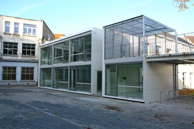 <p>Het oorspronkelijke gebouw, met een structuur in gewapend beton, werd ontworpen volgens een regelmatige grid van 4,80 x 4,80 m die we in het hele gebouw terugvinden. Het nieuwe gebouw is een metalen afgeleide van de principes die voor de oorspronkelijke bouw werden gehanteerd. De volledige structuur werd in staal uitgevoerd. De glazen daken kregen een gemengde structuur van hout en metaal en de passerelles werden in glas en staal uitgevoerd. </p>