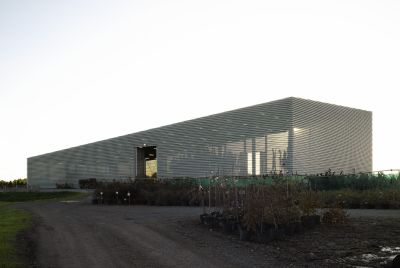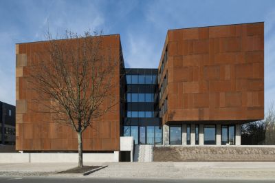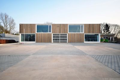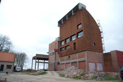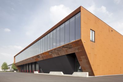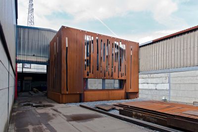 Tekst: De keuze van het gevelmateriaal is een essentieel element van dit project. De grote bouwvolumes zijn volledig bekleed met een beplating in weervast staal ('corten'), die het geheel niet alleen een industrieel karakter geeft maar ook specificiteit en warmte uitstraalt. Naast zijn natuurlijke verschijning met uitgesproken kleur, textuur en schakering, biedt het een grote kostenbesparing in exploitatiekost. Weervast staal is volledig onderhoudsvrij.