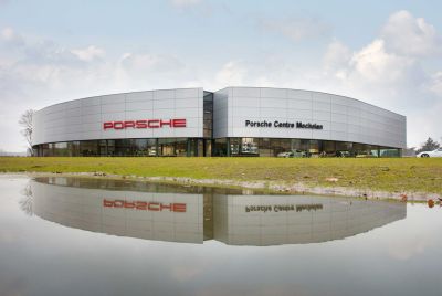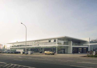 Tekst: <p>De autotempel, op een parking van de voormalige Philipssite in Brugge, omvat een toonzaal, werkplaats en kantoren. Door de eigentijdse, slanke en strakke architectuur weet deze ‘kijkdoos’ zich van bestaande realisaties in deze sector te onderscheiden. <br>
