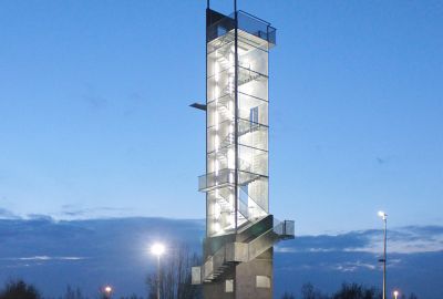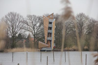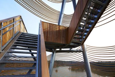 Tekst: Nu een 30 m hoge uitkijktoren een prachtig uitzicht over het gebied garandeert, smullen natuur- en architectuurliefhebbers voortaan nog meer van de Lommelse Sahara, een ongerept stukje natuur dat deel uit van het Regionaal Landschap ‘de Lage Kempen’. De constructie bestaat uit zes geschakelde driehoeken die omgeven zijn door circa vier kilometer scheepstouw. Door het touw afwisselend strak en los rond de toren te wikkelen, ontstaat een subtiele verwijzing naar de golvende lijnen van de Sahara.