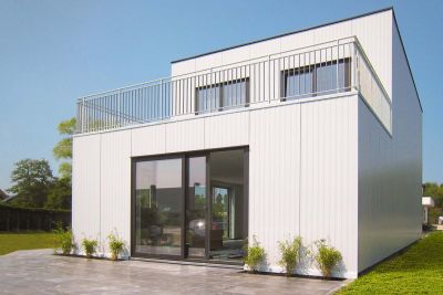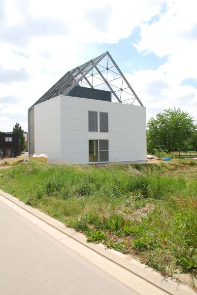 Tekst: Van op de vloerplaat werd een staalstructuur gemonteerd met sigmaprofielen. Zowel de dakopbouw als de tussenverdieping bestaat uit steeldeck (geprofileerde vloerplaten). De bekleding van de staalstructuur is samengesteld uit Joris Ide-sandwichpanelen met PIR isolatie. De buitenplaat is uit voorgelakt staal (Colorcoat HPS200 Ultra® - kleur Albatross). Uniek aan de woning is dat de ramen in de panelen geïntegreerd werden via het concept van window integration.