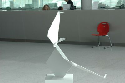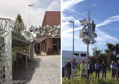 Tekst: Deze noodtrap in de vorm van een stalen doek is een zelfdragend kunstwerk dat bestaat uit 5 mm dikke staalplaten, onderverdeeld in 20 stukken en langs de randen verstevigd met stalen latten van 80 x 100 mm die de verschillende onderdelen met elkaar verbinden. De onderste strook, waaruit een kanttekening werd gelaserd, vormt de basis en wordt achter de plaat extra verstevigd door de samengestelde profielen en stalen buizen. Deze basis wordt op haar beurt met 14 stalen voeten in de fundering verankerd.