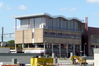 Tekst: <p>Het seinhuis in Gent Sint-Pieters werd uitgebreid met een verdieping voor de operatoren en een ruimte voor de uitrusting. Omwille van gewichtsbesparing werd gekozen voor een staalstructuur. Op het bestaand plat dak mochten enkel horizontale krachten overgedragen worden. Een roosterwerk van stalen liggers over de volledige oppervlakte draagt de krachten via taatsen af op de bestaande kolommen. De wanden steunen op deze liggers, nemen de windbelasting op en bestaan uit een rooster van kokerprofielen met een bekleding aan de buiten- en binnenzijde. Het dak heeft een gegolfde vorm en is ondersteund door kolommen, scharnierend uitgewerkt aan het uiteinde. De zijdelingse stabiliteit van het dak wordt verzekerd door nokken die steunen op windverbanden, ingewerkt in de wanden.