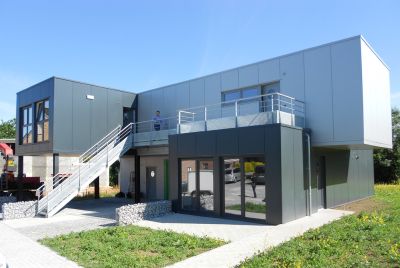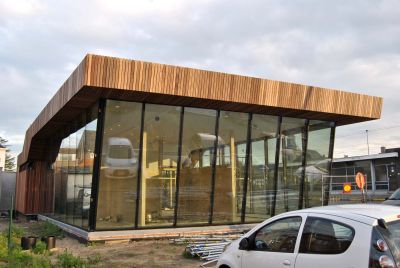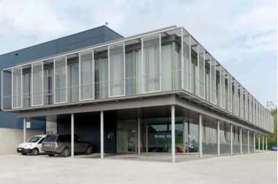 Tekst: <p>De uitbreiding bevindt zich aan de zijkant van het bestaande gebouw, met op de gelijkvloerse verdieping een ontvangstruimte, een opleidingszaal en personeelsruimten. Op de bovenverdieping bevinden zich kantoren en een vergaderzaal. Dit project omvat naast deze ruimten die noodzakelijk waren voor de groei van de onderneming, ook een etalage, een herkenningspunt voor de bezoekers. <br>