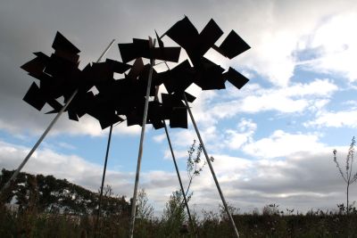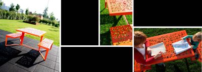 Tekst: In het kader van de aanleg van het Sint-Agathapark werden ferrometalen constructies, met name twee slagbomen en toegangsportalen in cortenstaal gebouwd, naast banken (metalen structuur met houten zitting) en een grote picknicktafel. Er werd gebruik gemaakt van een beperkt aantal, perfect op elkaar afgestemde materialen: hout, uitgewassen beton, terracotta, weervast staal.