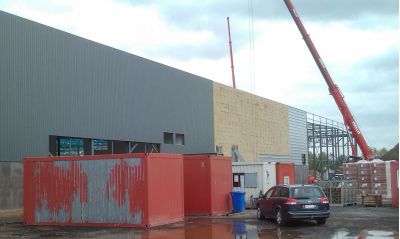 Tekst: <p>Gielen Containerservice uit Genk liet een gebouw optrekken waarin de installatie voor de recyclage van hout werd ondergebracht. Het eerste deel is de productiehal met een hoogte van 18 m, waarin de eigenlijke verwerkingsinstallatie staat opgesteld.<br>