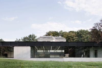 Tekst: De architect wilde de door de uitbreiding ingenomen grondoppervlakte maximaal beperken. Daarom heeft hij het "oorspronkelijke" huis behouden en het geïntegreerd in het zich in de lengterichting uitstrekkende hoofdvolume. De foyer bevindt zich aan de rand van het terrein. Hij vormt een transparante afsluiting die haast onmerkbaar overgaat in het landschap. Er werd gekozen voor ruwe materialen: hout, cortenstaal en aarde. Dit cortenstaal past heel erg goed in de houtrijke omgeving. En het is tegelijk mat en duidelijk zichtbaar.