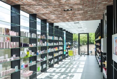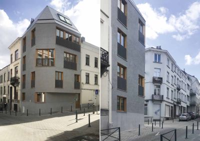 Tekst: Het project bestaat uit een gebouw voor gemengd gebruik met 8 passiefwoningen en een winkelruimte. De handelszaken zijn op de gelijkvloerse en eerste verdieping gelegen. Het gebouw is compact, met een sober en eenvoudig volume gekenmerkt door een knik om aan te sluiten op de rooilijn van de aanpalende gebouwen. De openingen in het gebouw stellen de bewoners in staat om veilig en ongezien vanaf de openbare ruimte op hun balkon te zitten. Het gebruikte staal voor de gevel bestaat uit geperforeerde panelen, gevouwen en gelakt in de werkplaats.