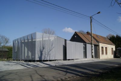 Tekst: <p>Het pompstation Sudcal bevindt zich aan de noordoostelijke ingang van de stad Esch-sur-Alzette. Het betreft een technisch gebouw dat tot doel heeft energie op te slaan en te transporteren als stadsverwarming in de periferie. <br />De keuze om staal te gebruiken voor de bekleding van het gebouw kan worden verklaard door de mogelijkheden die dit materiaal biedt. Het vlechtwerk uit roestvrij staal laat voor 60% de lucht door, wat betekent dat de door de technici vooropgestelde waarden worden gerespecteerd. Bovendien wordt tegemoetgekomen aan de eis van de architect dat de ventilatieroosters niet zichtbaar zouden zijn. <br />Het vlechtwerk is om de 3 m verticaal bevestigd met oogschroeven en wordt opgespannen door een klem met veer. Voor de pompzaal hebben de metalen stroken van het vlechtwerk een breedte van 2,00 m en een lengte van 6,60 m, voor het buffervat zijn ze 2,50 m breed en 14,00 m lang. Aangezien de stroken geprefabriceerd werden geleverd, was de tijd voor de montage erg kort.</p>