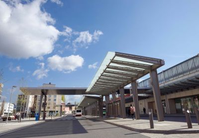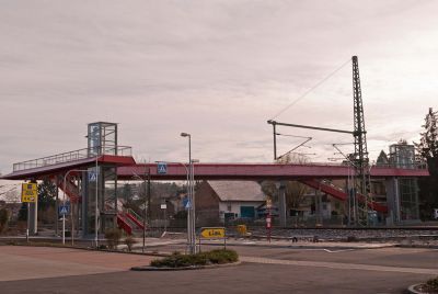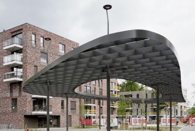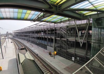 Tekst: De betrokken constructies behoren tot de tweede fase van de verwezenlijking van het Gewestelijk ExpresNet (GEN): de aanleg van een ondergrondse parking met toegangswegen; de bouw van een gang onder de sporen naar de perrons om de twee spoorwegbermen met elkaar te verbinden; de uitbreiding van het busstation en de aanleg van de wegen en de openbare ruimte. Weervast cortenstaal is het gemeenschappelijke kenmerk van alle kleine bouwwerken die op de plek opduiken en de openbare ruimte ritme verlenen.