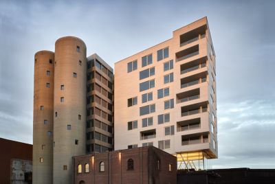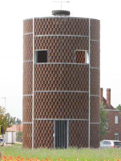 Tekst: <p>Een kunstliefhebber zocht een bestemming voor zijn kunstcollectie en vond hiervoor een geschikte ruimte in een oude bloemsilo langs het kanaal Bocholt-Herentals. Om de link met het industriële verleden te behouden, verkoos men de buitenschil en een aantal karakteristieke elementen integraal te bewaren: enkel de interne invulling van het monoliet siloblok diende totaal aangepast te worden aan de nieuwe functie. <br>