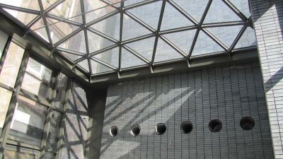 Tekst: Bij de uitbreiding van de Egmontcrypte in Zottegem werd een in het oog springende glazen koepel voorzien. Deze werd volledig opgebouwd uit stalen structuurelementen. De hoofdprofielen zijn gelaste stalen T-stukken met een variabele hoogte en een breedte van 60 mm. In de verticale vin zitten ovaalvormige uitsparingen. Tussen de hoofddragers werden stalen T-stukken T60 gebout, zodat de glasvlakken op vier zijden ondersteund worden.
