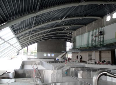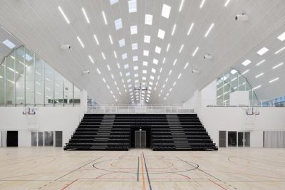 Tekst: De nieuwbouw omvat een dubbele sportzaal met een oppervlakte van 4800 m² met centraal er tussenin de dienstruimtes en tribunes. De dakstructuur bestaat uit drie booggewelven, loodrecht op deze indeling. De bijzondere dakstructuur geeft de nieuwbouw een eigen identiteit die in dialoog treedt met het opmerkelijke schaaldak van het bestaande zwembad. De dwarsdoorsnede van de dakstructuur bestaat uit een reeks van 3 driescharnierbogen opgebouwd uit op maat gebogen HEB300-profielen.