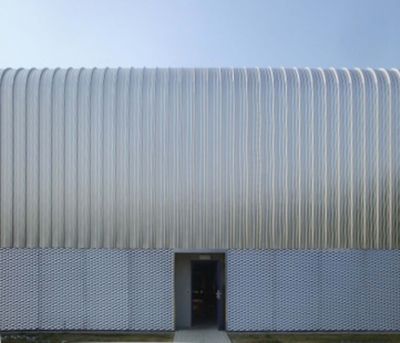 <p>De staalstructuur werd aangebracht op een massieve onderbouw. De gevels en het gebogen dakvlak werden afgewerkt in geprofileerd metaalbekleding. De loopvlakken aan de buitenzijde van het gebouw werden voorzien in verzinkte stalen looproosters. De borstweringen en muurafdekkingen bestaan uit geborstelde inox. Een deel van de gevelbekleding werd afgewerkt in geolied cederhout. </p>
